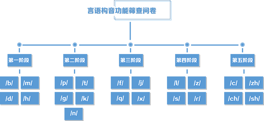 言语的发展分为呼吸、发声、共鸣、构音及语音五大板块。本问卷通过对汉语21个辅音音位构音能力的筛查评估,帮助治疗师快速判断儿童言语构音存在的问题,并自动给出康复建议并推送相关课件。